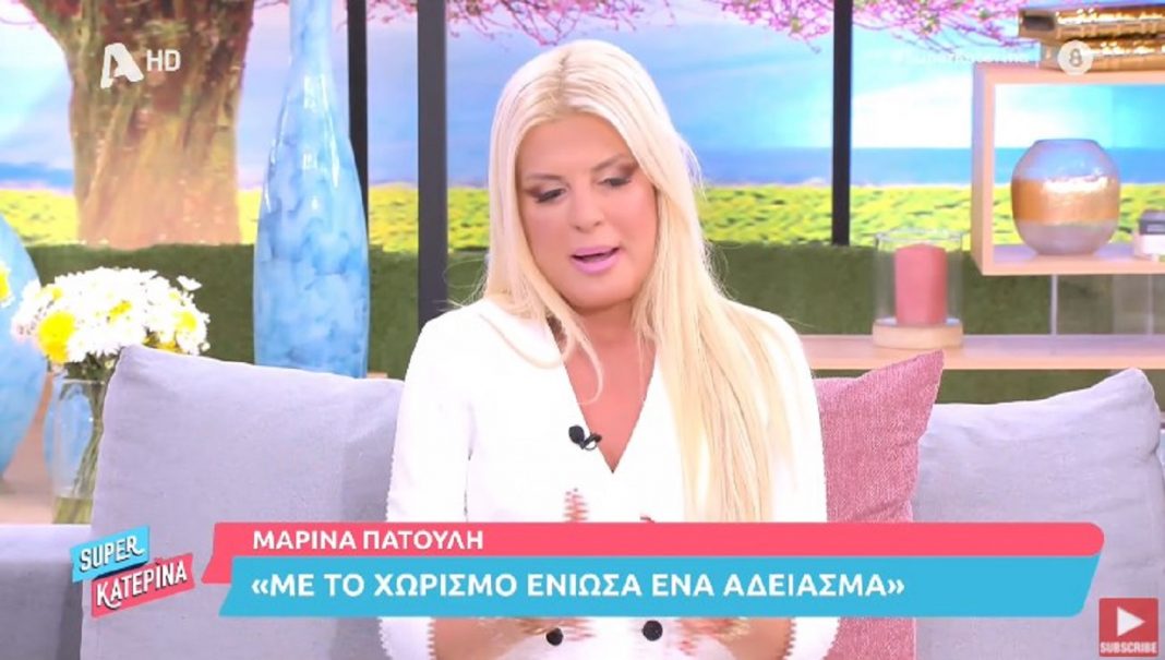 Μαρίνα Πατούλη: Σήμερα, Τρίτη 16 Νοεμβρίου, η Μαρίνα Πατούλη συνάντησε στην εκπομπή «Super Κατερίνα» την παλιά της μαθήτρια Κατερίνα Καινούργιου και μίλησαν για όλα. Η Μαρίνα Πατούλη μίλησε για το διαζύγιό της, για τις δύσκολες στιγμές που πέρασε, για τη συμπαράσταση του κόσμου, για την τωρινή της σχέση με τον Γιώργο Πατούλη, αλλά και για τη συμμετοχή της στο J2US. Μοιράστηκε μαζί μας ότι με τον χωρισμό της ένιωσε ένα άδειασμα, ότι πόνεσε πάρα πολύ γιατί δεν ήταν δική της απόφαση, αλλά κατάλαβε ότι έπρεπε να στηρίξει το παιδί της. Συνεχίζει λέγοντας ότι, με τον χωρισμό της, εξαφανίστηκαν και πολλοί φίλοι της και πως ένιωσε να ματαιώνεται η ζωή της.