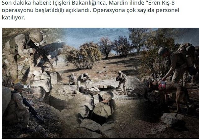 «Έκτακτη είδηση: Το Υπουργείο Εσωτερικών ανακοίνωσε ότι «η επιχείρηση Eren Χειμώνας – 8, ξεκίνησε στην επαρχία Μαρντίν. Στην επιχείρηση συμμετέχει μεγάλος αριθμός ένοπλων δυνάμεων», γράφει τούρκικο δημοσίευμα.
