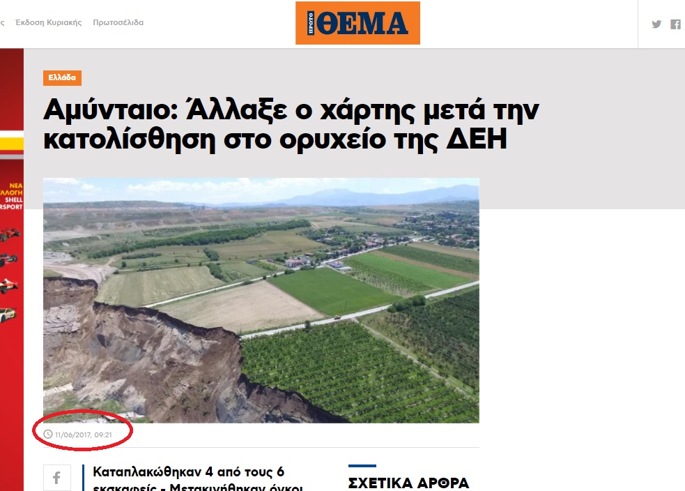 Υπέδειξε μάλιστα συγκεκριμένο μέρος τοποθέτησης των εκσκαφέων για την προστασία τους, οι οποίοι όμως καταπλακώθηκαν από τεράστιες μάζες αδρανών υλικών, μαζί με τους ιμάντες, τους ταινιοδρόμους του ορυχείου και το κοίτασμα των 28 εκατ. τόνων» ( «Καθημερινή», 13.6.2017).Στην αρχή επιχειρήθηκε να αποδοθούν ευθύνες στην Αρχαιολογική Υπηρεσία, η οποία διενεργούσε έρευνες στην ίδια περιοχή , όμως ο καθηγητής Λουπασάκης (ΕΜΠ) που επισκέφτηκε τον τόπο μετά την κατολίσθηση αποφάνθηκε σαφώς ότι οφείλεται στην εξορυκτική δραστηριότητα .