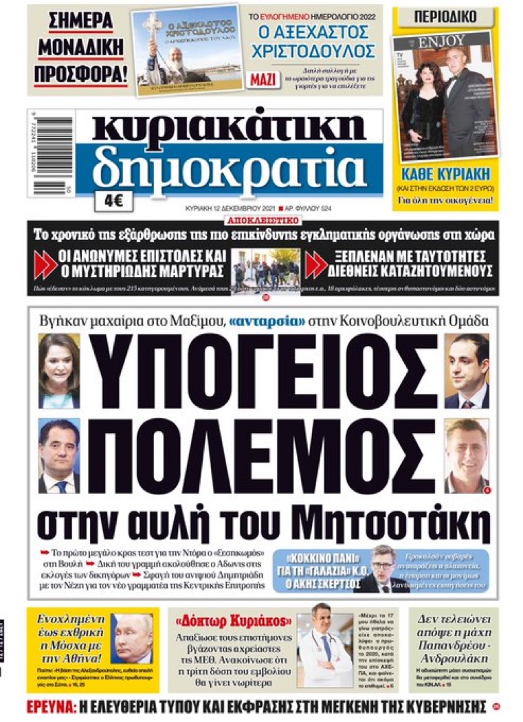 Αποκαλυπτική και αυτή την Κυριακή η Εφημερίδα ΔημοκρατίαΣτις 30.11 για πρώτη φορά με την κυριακάτικη «δημοκρατία»: