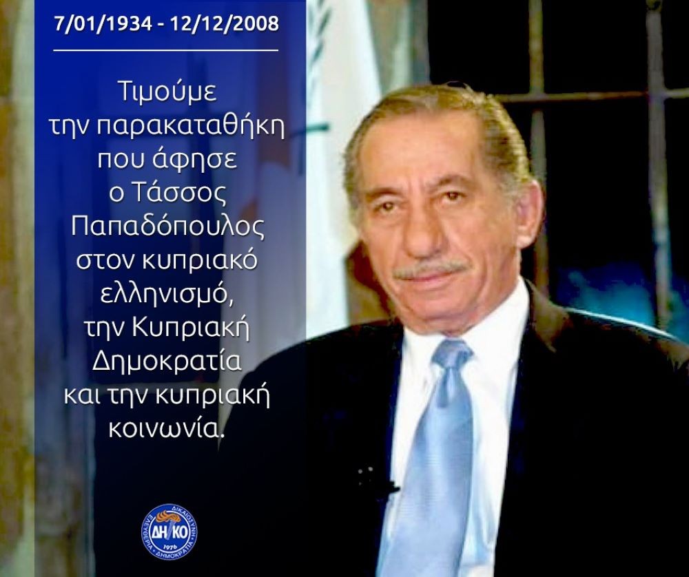 Το Δημοκρατικό Κόμμα, τιμά τη μνήμη του Τάσσου Παπαδόπουλου με υψηλό το αίσθημα της ευθύνης για το βάρος της κληρονομιάς που έχουμε παραλάβει από τον αείμνηστο Πρόεδρο μας.
