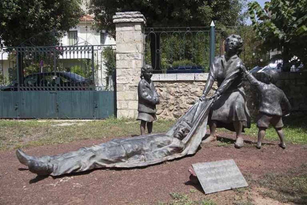 Άγαλμα του Ν. Δημόπουλου, που παριστάνει την Καλαβρυτινή μάνα, όπου με μια κουβέρτα τραβά τον σκοτωμένο άντρα της για να τον θάψει. Το άγαλμα βρίσκεται στο προαύλιο του σχολείου όπου έκλεισαν οι Γερμανοί τα γυναικόπαιδα και που σήμερα λειτουργεί ως Μουσείο Ολοκαυτώματος.