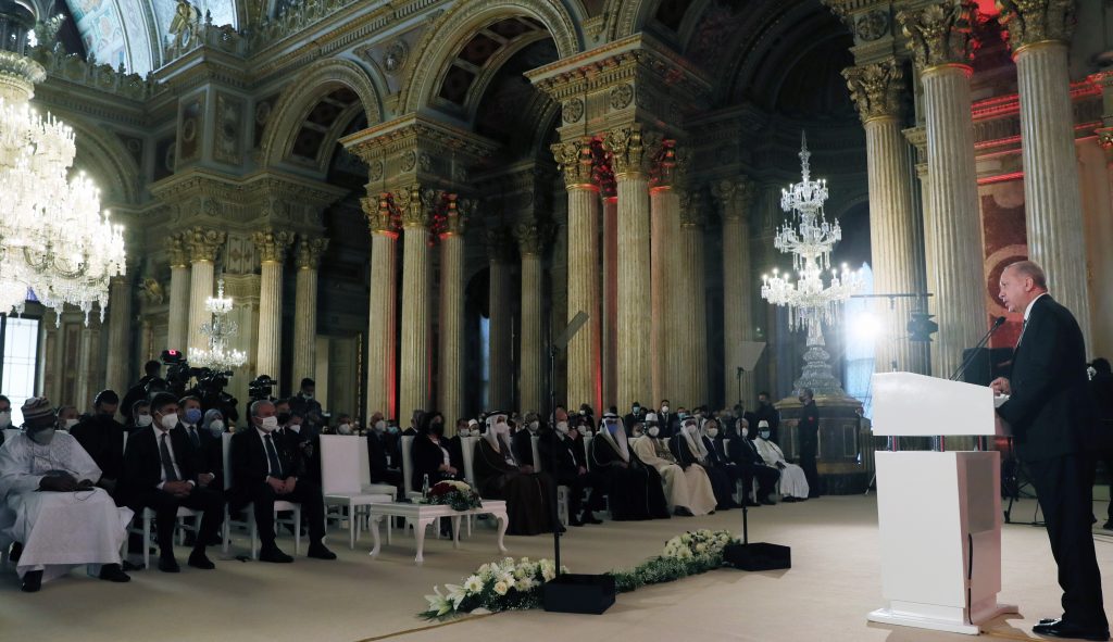 Φωτό: Ο Πρόεδρος της Τουρκικής Δημοκρατίας κατά την προσφώνηση του στην Ισλαμική Διάσκεψη που οργανώθηκε στην Κωνσταντινούπολη την 10/10/2021.