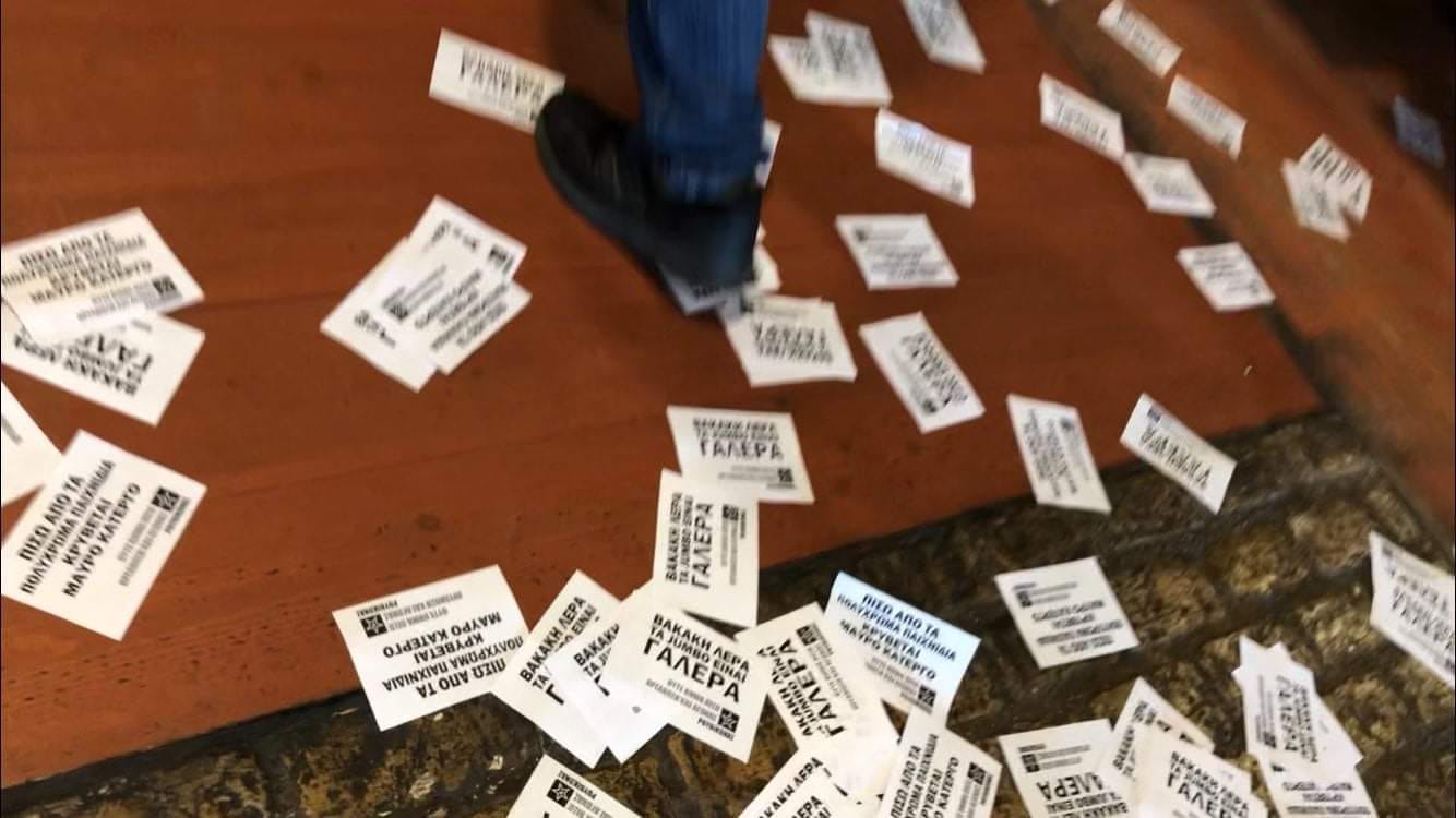 Μέλη του Ρουβίκωνα πραγματοποίησαν σήμερα επίσκεψη διαμαρτυρίας στα κεντρικά γραφεία της αλυσίδας παιχνιδιών Jumbo, στο Μοσχάτο, πετώντας τρικάκια και φωνάζοντας συνθήματα.