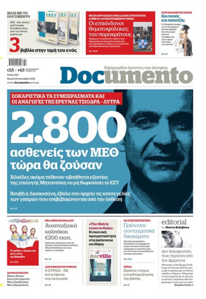 Αποκαλυπτικό πρωτοσέλιδο της εφημερίδας Documento του Κώστας Βαξεβάνη που κυκλοφορεί αύριο, Κυριακή.