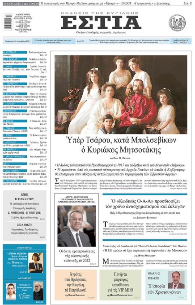Το πρωτοσέλιδο της εφημερίδας Εστια που κυκλοφορεί αύριο Παρασκευή, λόγω των Χριστουγέννων.