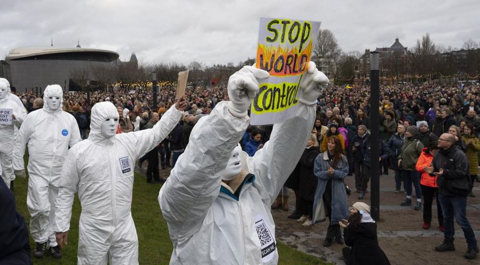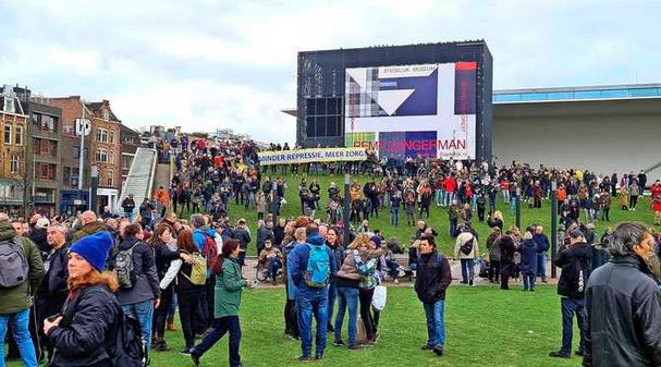 Πριν την αστυνομική επέμβαση, οι διαδηλωτές ξεδίπλωσαν ένα πανό που έγραφε: «Λιγότερη καταστολή, περισσότερη υγεία» κοντά στο Μουσείο Van Gogh.
