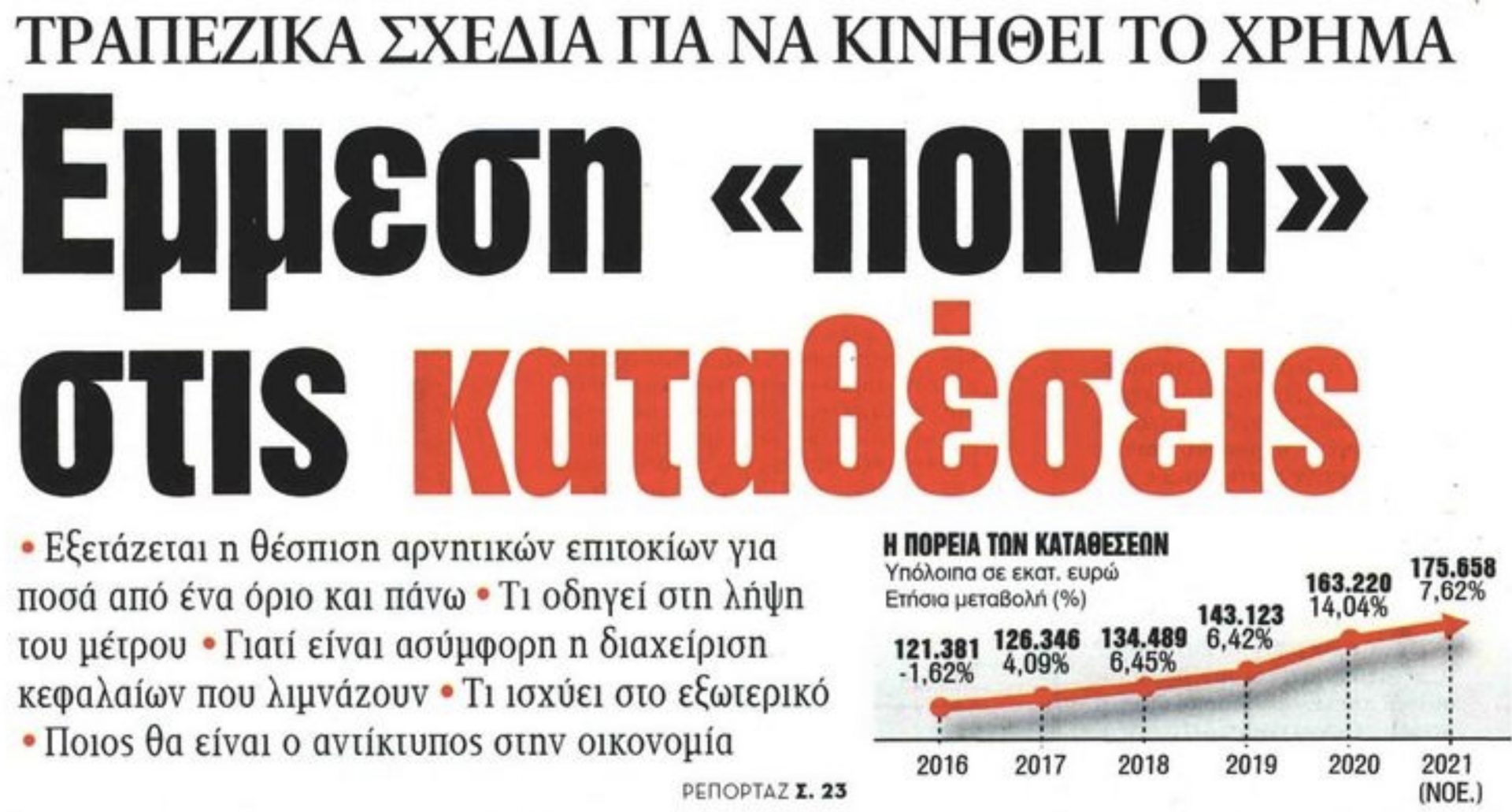 Το σημερινό κύριο θέμα των Νέων, είναι σίγουρα προπομπός για την επόμενη πράξη του «δράματος Μητσοτάκη». Με πρόσχημα μάλιστα την κίνηση των κεφαλαίων τα οποία «λιμνάζουν» στις τράπεζες. Δηλαδή ο Κυριάκος Μητσοτάκης ετοιμάζεται να δώσει και την χαριστική βολή στον καπιταλισμό, αφού εδώ και πάνω από έναν αιώνα, οι τράπεζες υποτίθεται ότι εκμεταλλεύονται τις καταθέσεις των πελατών τους για να παρέχουν ρευστότητα στην ελεύθερη οικονομία, προκειμένου αυτή να λειτουργήσει.