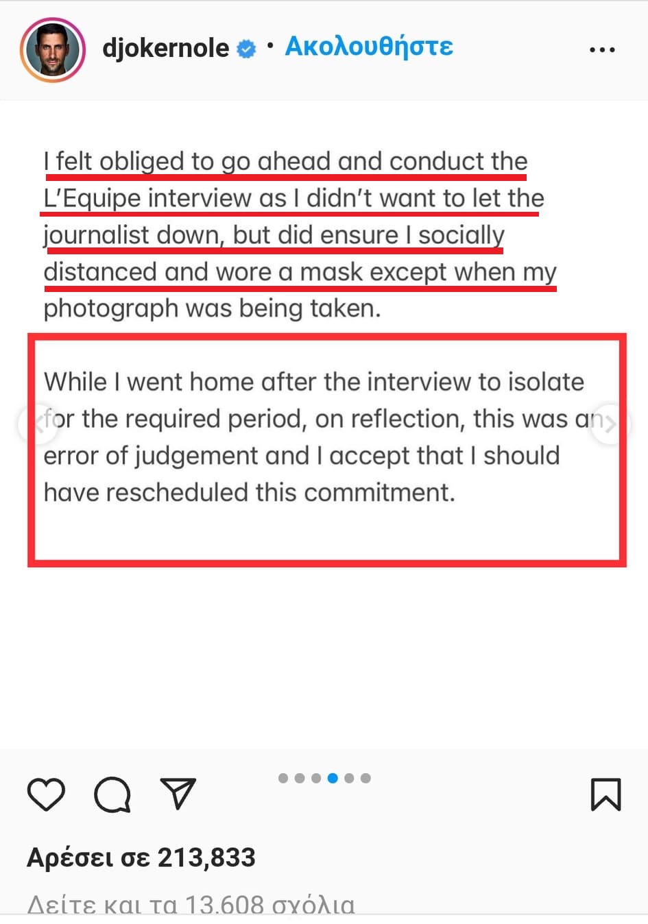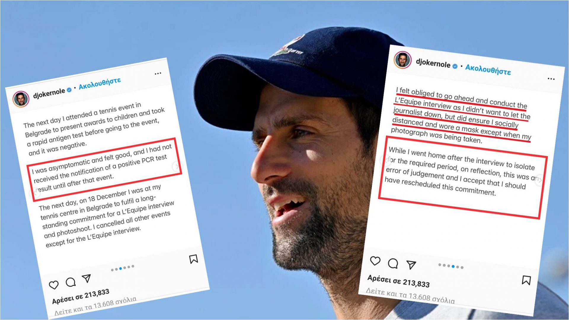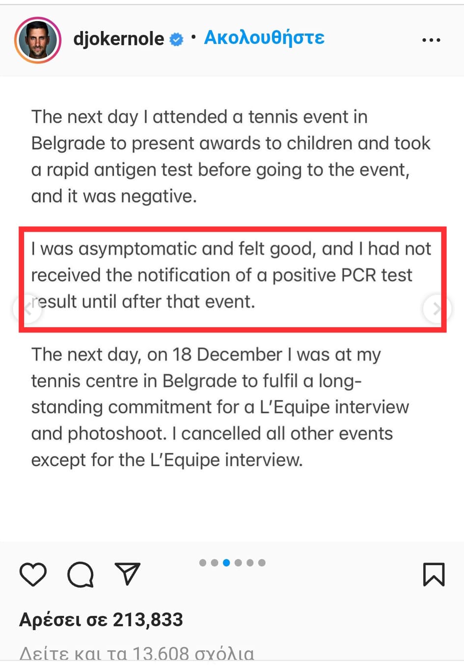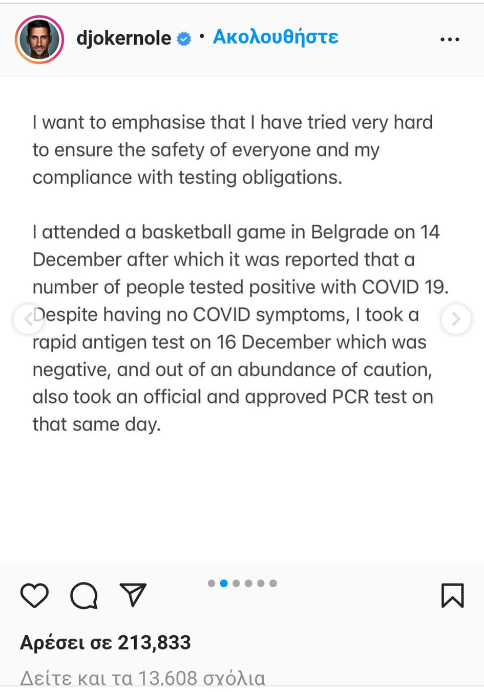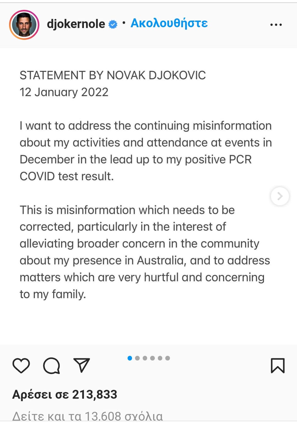 Ανακοίνωση ανέβασε ο Τζόκοβιτς, στις 12 Ιαν. 2022, στη σελίδα του στο Ίνσταγκραμ…