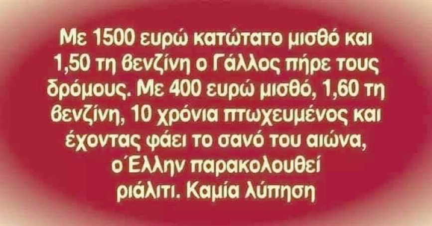 Με 400 ευρώ μισθό, 1,60 τη βενζίνη, 10 χρόνια πτωχευμένος, και έχοντας φάει το #σανό του αιώνα, ο Έλλην παρακολουθεί ριάλιτι.