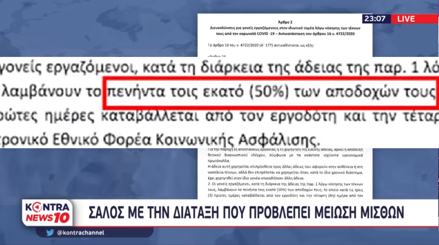 Η ρύθμιση προβλέπει «χαράτσι» 50% στο μισθό. «Οι γονείς εργαζόμενοι, κατά τη διάρκεια της άδειας της παρ. 1 λόγω νόσησης των τέκνων τους, λαμβάνουν το πενήντα τοις εκατό (50%) των αποδοχών τους, το οποίο κατά τις τρεις (3) πρώτες ημέρες καταβάλλεται από τον εργοδότη και την τέταρτη (4η) ημέρα από τον Ηλεκτρονικό Εθνικό Φορέα Κοινωνικής Ασφάλισης» αναφέρει η τροπολογία.