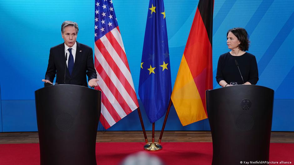Από την πλευρά του ο αμερικανός υπουργός Εξωτερικών Άντονι Μπλίνκεν επανέλαβε την προειδοποίηση που έχει ήδη απευθύνει προς τη Μόσχα.«Κάθε παραβίαση των συνόρων από τα ρωσικά στρατεύματα στην Ουκρανία αποτελεί επιθετική πράξη, η οποία θα προκαλέσει μία γρήγορη, σοβαρή και κοινή απάντηση» της Δύσης. Πρωταρχικός στόχος είναι μία διπλωματική επίλυση της κρίσης, ανέφερε ο Μπλίνκεν, για να προσθέσει όμως ότι «όποιον δρόμο κι αν διαλέξει η Ρωσία, θα βρει ενωμένους τις ΗΠΑ και τους συμμάχους της». Στις διαβουλεύσεις του Βερολίνου συμμετείχαν, εκτός από τους Μπέρμποκ και Μπλίνκεν, ο γάλλος υπουργός Εξωτερικών Ζαν Υβ Λεντριάν και ο βρετανός υφυπουργός Εξωτερικών Τζέιμς Κλέβερλι.