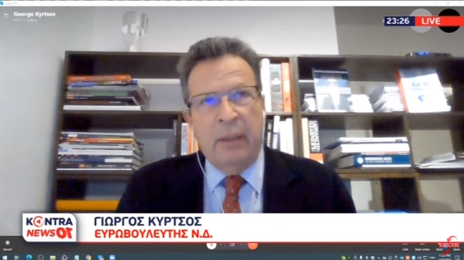 Ο ευρωβουλευτής της ΝΔ Γιώργος Κύρτσος και δημοσιογράφος στο Kontra News 10 με τον Γιώργο Μελιγγώνη