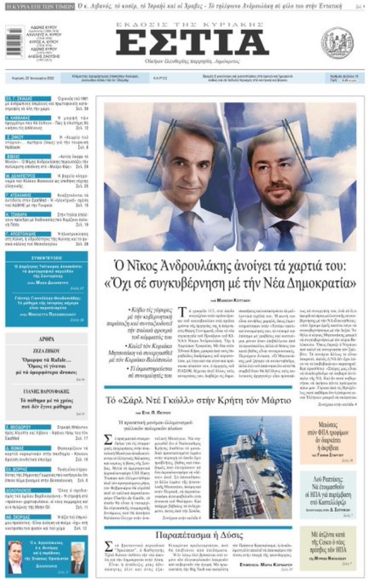 Αποκαλυπτικη και αυτή την Κυριακή η εφημεριδα Εστια με πρωτοσέλιδο φωτια για τον Νίκο Ανδρουλακη. Κόβει κάθε γέφυρα με τον Μητσοτάκη, αρνήθηκε ακόμα και να συναντηθεί μαζί του!