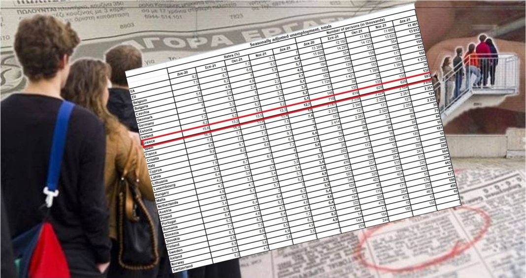 Η Eurostat στην τελευταία της έκθεση εκτιμά ότι…13,612 εκατομμύρια άνδρες και γυναίκες στην ΕΕ, εκ των οποίων 11,481 εκατομμύρια στη ζώνη του ευρώ, ήταν άνεργοι τον Δεκέμβριο του 2021. Σε σύγκριση με τον Νοέμβριο του 2021, ο αριθμός των ανέργων μειώθηκε κατά 210000 στην ΕΕ και κατά 185.000 στη ζώνη του ευρώ. Σε σύγκριση με τον Δεκέμβριο του 2020, η ανεργία μειώθηκε κατά 2,196 εκατομμύρια στην ΕΕ και κατά 1,828 εκατομμύρια στη ζώνη του ευρώ.