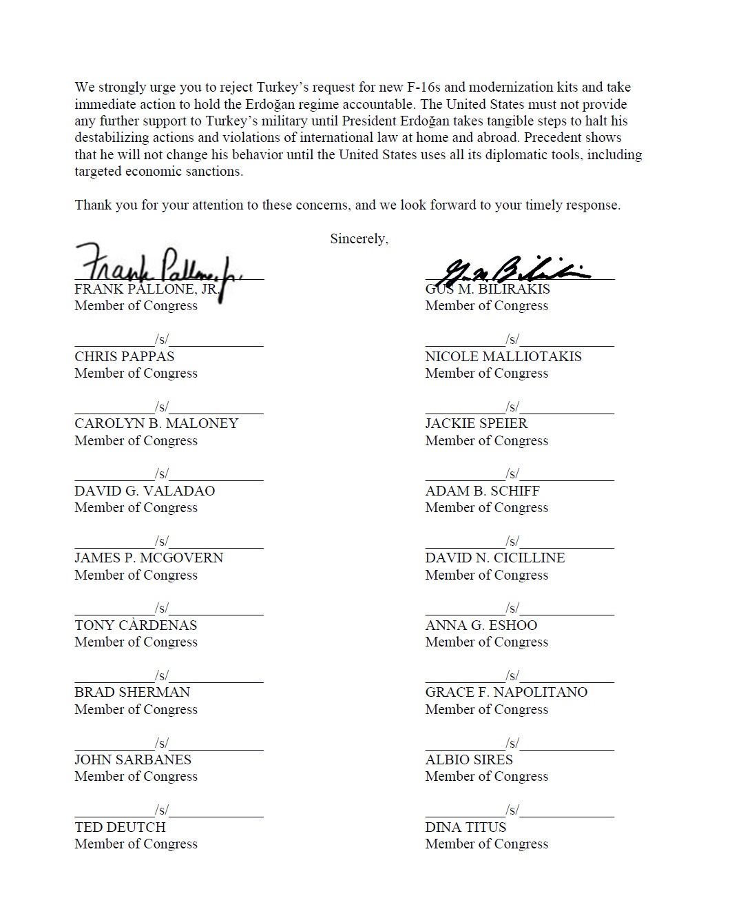 Μέλη του Κογκρέσου που συνυπογράφουν την επιστολή προς την κυβέρνηση Μπάιντεν μαζί με τους Αντιπροσώπους Pallone και Μπιλιράκη είναι οι αντιπρόσωποι: Jake Auchincloss (D-MA), Tony Cardenas (D-CA), Judy Chu (D-CA), David Cicilline (D- RI), Katherine Clark (D-MA), Bonnie Watson Coleman (D-NJ), Jim Costa (D-CA), Danny Davis (D-IL), Ted Deutch (D-FL), Mario Diaz-Balart (R -FL), Anna Eshoo (D-CA), Louie Gohmert (R-TX), Jimmy Gomez (D-CA), Josh Gottheimer (D-NJ), Raul Grijalva (D-AZ), Ro Khanna (D-CA ), Raja Krishnamoorthi (D-IL), Barbara Lee (D-CA), Zoe Lofgren (D-CA), Alan Lowenthal (D-CA), Nicole Malliotakis (R-NY), Carolyn Maloney (D-NY), Kathy Manning (D-NC), James McGovern (D-MA), Grace Meng (D-NY), Grace Napolitano (D-CA), Eleanor Holmes Norton (D-DC), Chris Pappas (D-NH), Chellie Pingree (D-ME), Mark Pocan (D-WI), Katie Porter (D-CA), Jamie Raskin (D-MD),Lucille Roybal-Allard (D-CA), Bobby Rush (D-IL), Linda Sanchez (D-CA), John Sarbanes (D-MD), Janice Schakowsky (D-IL), Adam Schiff (D-CA), Brad Schneider (D-IL), Brad Sherman (D-CA), Albio Sires (D-NJ), Christopher Smith (R-NJ), Jackie Speier (D-CA), Tom Suozzi (D-NY), Mark Takano (D-CA), Dina Titus (D-NV), Lori Trahan (D-MA), David Valadao, (R-CA), Peter Welch (D-VT) και Susan Wild (D-PA).