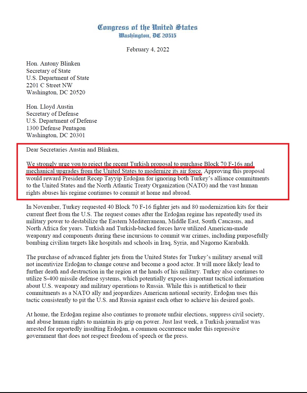 «Σας προτρέπουμε σθεναρά να απορρίψετε το αίτημα της Τουρκίας για νέα F-16 και κιτ εκσυγχρονισμού και να λάβετε άμεσα μέτρα για να λογοδοτήσει το καθεστώς Ερντογάν», αναφέρει η επιστολή του Κογκρέσου της 4ης Φεβρουαρίου προς τον υπουργό Εξωτερικών Antony Blinken και τον Υπουργό Άμυνας Lloyd Austin. «Οι Ηνωμένες Πολιτείες δεν πρέπει να παράσχουν περαιτέρω υποστήριξη στον τουρκικό στρατό, έως ότου ο Πρόεδρος Ερντογάν λάβει απτά βήματα για να σταματήσει τις αποσταθεροποιητικές του ενέργειες και τις παραβιάσεις του διεθνούς δικαίου στο εσωτερικό και στο εξωτερικό. Το προηγούμενο δείχνει ότι δεν θα αλλάξει τη συμπεριφορά του έως ότου οι Ηνωμένες Πολιτείες χρησιμοποιήσουν όλα τα διπλωματικά τους εργαλεία, συμπεριλαμβανομένων των στοχευμένων οικονομικών κυρώσεων».
