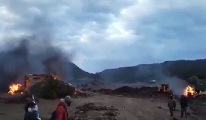 Η αστυνομική δύναμη που υπήρχε στο σημείο δεν κατάφερε να εμποδίσει τους κατοίκους, οι οποίοι πέρασαν εκεί που βρίσκονταν τα μηχανήματα βάζοντας φωτιά και προκαλώντας φθορές σε μηχανήματα, σε μια γεννήτρια και στις χημικές τουαλέτες που χρησιμοποιούν οι εργάτες.