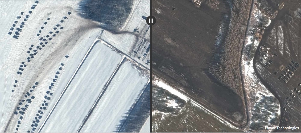 εταιρεία με έδρα στο Κολοράντο που φωτογραφίζει περισσότερα από 3 εκατομμύρια τετραγωνικά χιλιόμετρα της Γης κάθε μέρα, τράβηξε φωτογραφίες από ένα ρωσικό στρατόπεδο στη Ρετσίτσα της Λευκορωσίας. Σειρές στρατιωτικών οχημάτων ήταν απλωμένες, πάνω από ένα χοντρό χαλί χιονιού λιγότερο από 50 χιλιόμετρα από τα σύνορα με την Ουκρανία. Στις 14 Φεβρουαρίου ένας παρόμοιος δορυφόρος τράβηξε άλλη μια φωτογραφία της Ρεχίτσας. Το χιόνι είχε φύγει όπως επίσης και τα περισσότερα από τα οχήματα (βλ. παραπάνω)