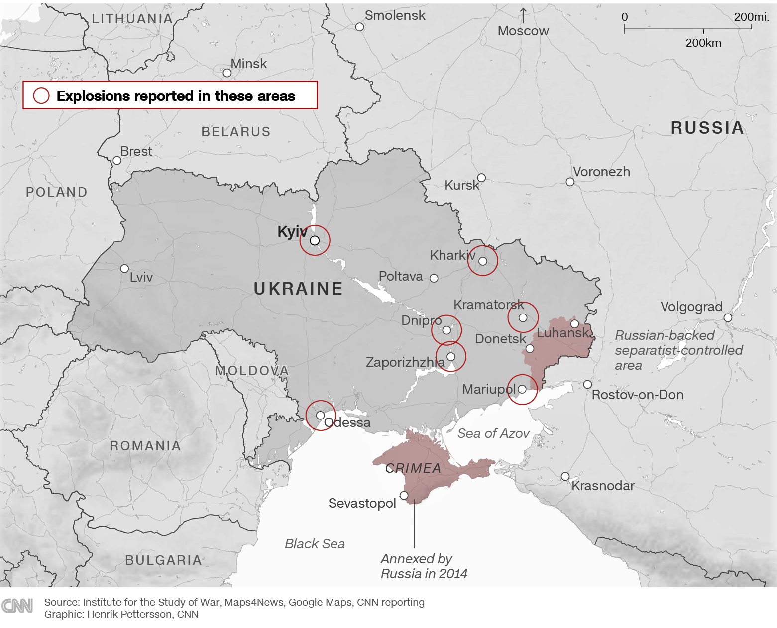 Δημοσιογράφοι και πηγές του CNN σε πόλεις σε όλη την Ουκρανία ανέφεραν ότι, άκουσαν εκρήξεις τις πρώτες πρωινές ώρες της Πέμπτης.
