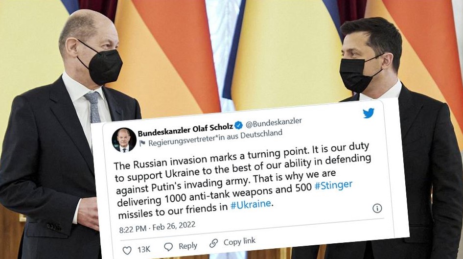 “Η ρωσική επίθεση σηματοδοτεί μια αλλαγή στους καιρούς. Είναι καθήκον μας να υποστηρίξουμε την Ουκρανία όσο μπορούμε να αμυνθούμε ενάντια στον στρατό εισβολής του Πούτιν. Ως εκ τούτου θα παραδώσουμε 1.000 αντιαρματικά όπλα και 500 πυραύλους Stinger στους φίλους μας στην Ουκρανία”, δήλωσε ο Γερμανός Καγκελάριος Όλαφ Σόλτς