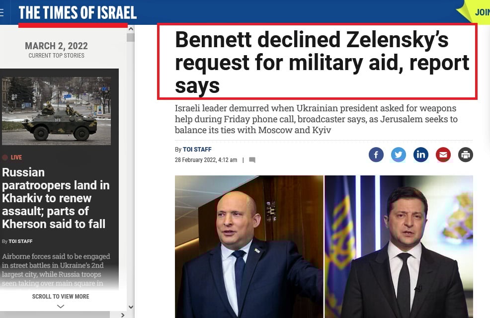 Ο Πρωθυπουργός Μπένετ εξέφρασε την διαφωνία του όταν ο Ουκρανός πρόεδρος Ζελένσκι, ζήτησε από το Ισραήλ στρατιωτική βοήθεια, σύμφωνα με δημοσίευμα της Κυριακής.
