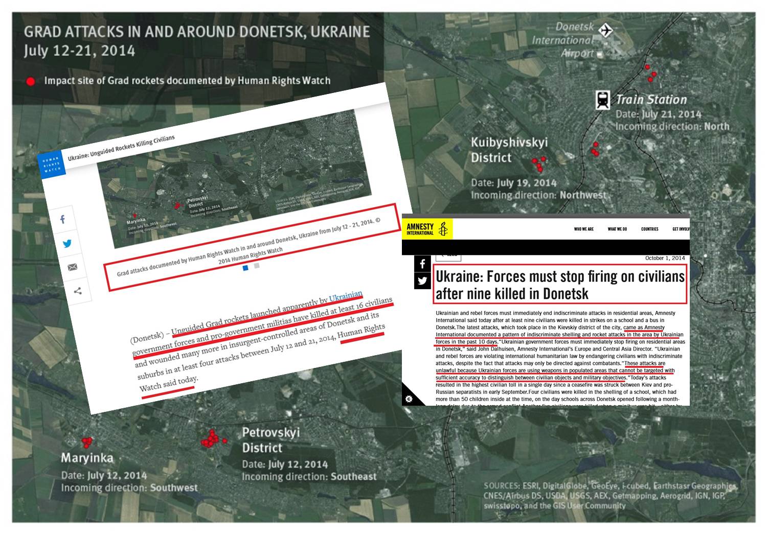 «Οι ουκρανικές κυβερνητικές δυνάμεις πρέπει να σταματήσουν αμέσως να πυροβολούν κατοικημένες περιοχές στο Ντόνετσκ», δήλωσε ο John Dalhuisen, Ευρώπη και Κεντρική Ασία της Διεθνούς Αμνηστίας Διευθυντής. «Οι ουκρανικές και αντάρτικες δυνάμεις παραβιάζουν το διεθνές ανθρωπιστικό δίκαιο θέτοντας σε κίνδυνο τους αμάχους με αδιάκριτες επιθέσεις, παρά το γεγονός ότι οι επιθέσεις μπορούν να στρέφονται μόνο εναντίον μαχητών». για τη διάκριση μεταξύ πολιτικών αντικειμένων και στρατιωτικών στόχων.»