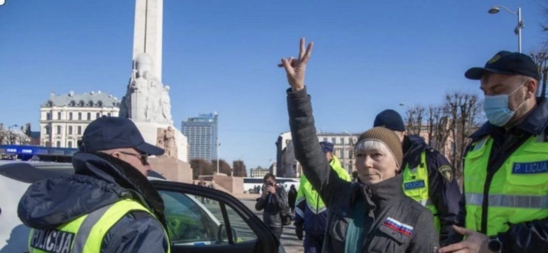 Στην προχθεσινή εκδήλωση μίσους και αίσχους, μία γυναίκα (φωτό) που τόλμησε να διαμαρτυρηθεί, συνελήφθη και αντιμετωπίζει σοβαρές κατηγορίες, όπως έχουν αυτές θεσμοθετηθεί από την κυβέρνηση της Λετονιας. Επειδή στο παλτό της έφερε την ρωσική σημαία.