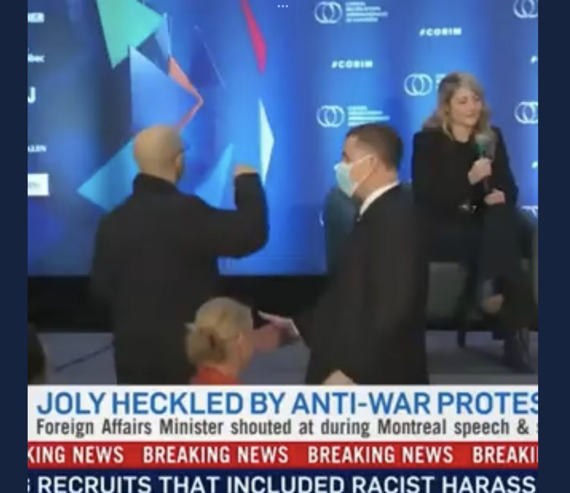 Την ώρα που η Καναδή υπουργός εξωτερικών Melanie Joly μιλούσε σε εκδήλωση, ακτιβιστής την διέκοψε κατηγορώντας την ότι με την αποστολή όπλων στην Ουκρανία, επιχειρούν να ξεκινήσουν τον τρίτο παγκόσμιο πόλεμο.
