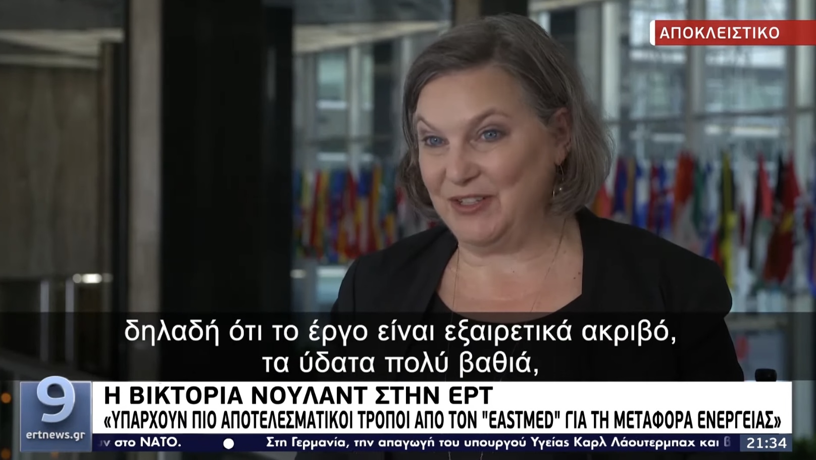 Συνέντευξη στην ανταποκρίτρια της ΕΡΤ στην Ουάσιγκτον, Λένα Αργύρη, παραχώρησε η υφυπουργός Εξωτερικών των ΗΠΑ Βικτώρια Νούλαντ, που έβαλε ταφόπλακα στον αγωγό EastMed και προσπάθησε να μας ρίξει στάχτη στα μάτια.
