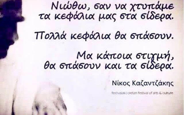 ΚΑΙ ΕΓΩ …….Νοιώθω, σαν να χτυπάμε τα κεφάλια μας στα σίδερα. Πολλά κεφάλια θα σπάσουν. Μα κάποια στιγμή θα σπάσουν και τα σίδερα. ( Καζαντζάκης Ν.)