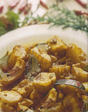 Βάζουμε μες στον ταβά (τη ρηχή κατσαρόλα μας) τις πατάτες και ανακατεύουμε δυο με τρεις φορές όλα μαζί, πατάτες και κρεμμύδια. Προσθέτουμε τόσο νερό ώστε να σκεπαστούν οι πατάτες και ρίχνουμε τα δαφνόφυλλα, το μαυροπίπερο, το αλάτι και δυναμώνουμε τη φωτιά. Έπειτα από τριάντα λεπτά βρασμού προσθέτουμε τα υπόλοιπα μπαχαρικά και τον τοματοπολτέ αραιωμένο σε νερό. Ανακατεύουμε καλά και χαμηλώνουμε τη φωτιά στο μισό.