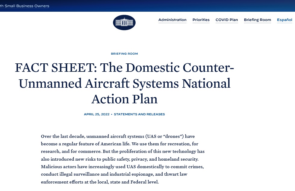 Ο κατάλογος των συστάσεων περιγράφεται σε μια δήλωση με τίτλο “The Domestic Counter-Unmanned Aircraft Systems National Action Plan”, η οποία δημοσιεύτηκε από τον Λευκό Οίκο στις 25 Απριλίου. Το έγγραφο αναφέρει ότι η κυβέρνηση Μπάιντεν “καλεί το Κογκρέσο, να εγκρίνει νομοθεσία για να καλύψει τα κρίσιμα κενά στην υπάρχουσα νομοθεσία και πολιτική, που εμποδίζουν επί του παρόντος την κυβέρνηση και τη νομοθεσία να προστατεύσουν τον αμερικανικό λαό και τα ζωτικά μας συμφέροντα για την ασφάλεια».