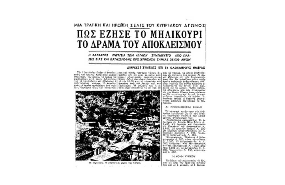 4000 Άγγλοι στρατιώτες και εκατοντάδες Τούρκοι πραιτωρανοί τους, επιβάλλουν κατ΄ οίκον περιορισμό στους ηρωϊκούς κατοίκους του Μηλικουρίου διάρκειας 54 ημερών με τη προσδοκία, ότι οι αντάρτες της ΕΟΚΑ θα παραδοθούν. ΟΥΔΕΙΣ ΠΑΡΑΔΩΘΗΚΕ.