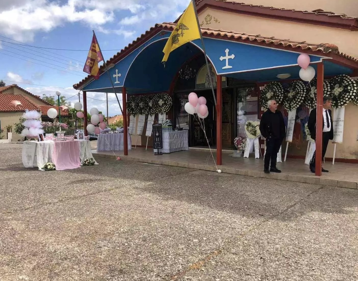 Η οικογένεια της μικρής Κατερίνας την αποχαιρέτησε με ροζ μπαλόνια και κουφέτα, με τον στολισμό στην εκκλησία του Αγίου Ιερόθεου να θυμίζει βάπτιση. Ταυτόχρονα, πολλοί συγγενείς και φίλοι της οικογένειας έστειλαν στεφάνια.