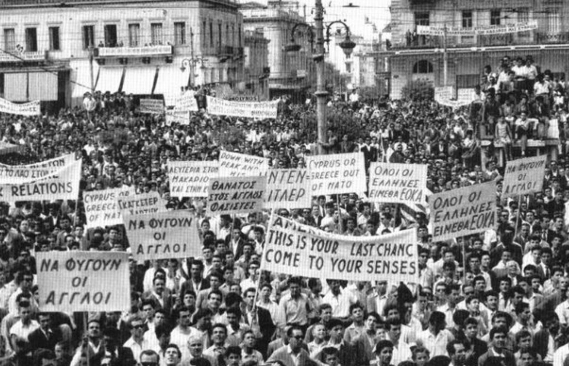 Σημ, Το κυπριακό ζήτημα αποτελεί περίτρανη απόδειξη του προαναφερθέντος τρόπου σκέψης και λειτουργίας των ελληνικών ελίτ. Αρχικά το επίσημο ελληνικό κράτος αποθάρρυνε ενεργά ακόμη και τον αγώνα για Αυτοδιάθεση των Κυπρίων και Ένωση με την Ελλάδα. Στη συνέχεια αναγκάστηκε να τον υποστηρίξει χλιαρά και απρόθυμα, υπό την ασφυκτική πίεση της ελληνικής κοινής γνώμης.  Φυσικά η εντολή της ελληνικής κυβέρνησης προς την αστυνομία να μην προσεγγίσουν οι διαδηλωτές στην Βρετανική Πρεσβεία τηρήθηκε κατά γράμμα και η αστυνομία με άνωθεν εντολές,κάποια στιγμή ανοίγει πυρ και με τον πρώτο νεκρό επικρατεί πανικός. Τελικός απολογισμός τρεις νεκροί διαδηλωτές κι ένας αστυνομικός.
