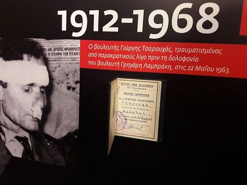 Στις 27 Μαΐου του 1963, το βράδυ της δολοφονίας του Γρηγόρη Λαμπράκη, ο Γιώργος Τσαρουχάς δέχτηκε και αυτός επίθεση, ενώ κατευθυνόταν στην αίθουσα που θα μιλούσε ο Λαμπράκης, με αποτέλεσμα να τραυματιστεί στο κεφάλι και να μεταφερθεί αιμόφυρτος στο νοσοκομείο όπου νοσηλεύτηκε 29 ημέρες. Ήταν δε βασικός μάρτυρας κατηγορίας στη δίκη των δολοφόνων του Λαμπράκη.