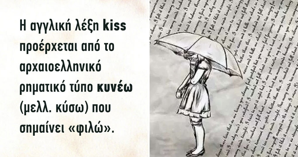 Η ετυμολογική της ιστορία είναι μάλλον περιπετειώδης και οι γλωσσολόγοι ερίζουν για το κατά πόσο η αγγλική λέξη kiss προέρχεται από το αρχαιοελληνικό ρηματικό τύπο κυνέω (μελλ. κῦσω) που σημαίνει “φιλώ”. Χωρίς να θέλουμε να μπούμε σε ξένα χωράφια, υπάρχουν μελετητές που υποστηρίζουν ότι υπήρχε η κοινή ινδο-ευρωπαϊκή ρίζα Ku, την οποία οι λατινογενείς γλώσσες – και κατ’ επέταση η αγγλική – χρησιμοποίησαν ως βάση για τις δικές τους λέξεις. Η θεωρία στηρίζεται στο γεγονός ότι η σημασία του φιλιού ήταν πρωτεύουσας θρησκευτικής σημασίας στην λατρεία όλων των λαών, εξ’ ου και η κοινή ρίζα.