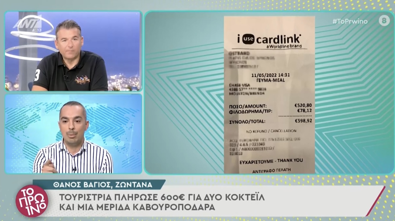 Πρωτοφανής καταγγελία απο τουρίστρια για επέμβαση μπράβων οταν διαμαρτυρήθηκε για τον λογαριασμό. Διεθνής διασυρμός της χώρας μας στα ξένα μεσα. Μάλιστα οι καταγγελίες δεν σταματούν εκει καθως ο δημοσιογράφος που παρουσίασε το θεμα καταγγέλει και ο ίδιος πως οταν επισκεφτηκε συγκεκριμένο εστιατόριο στην περιοχή, τον ανάγκασαν να πετάξει το μπουκαλάκι νερο που είχε και να αγοράσει αλλο με 5 ευρω.