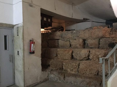 Αριστερά ένα ασανσέρ και μία εσοχή του σύγχρονου οικοδομήματος που σηκώνεται προς τα πάνω σώζουν ένα ακόμη κομμάτι του αρχαίου τείχους.