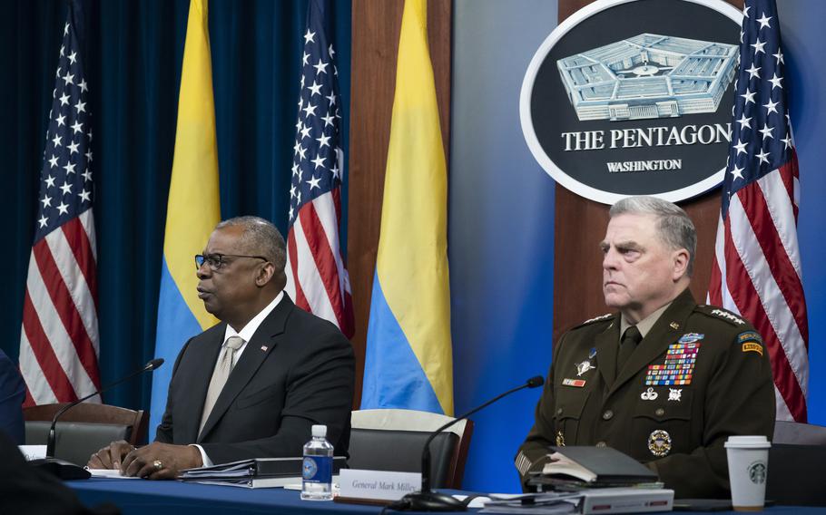 Η Δανία θα παράσχει εκτοξευτήρες Harpoon και πυραύλους για να υπερασπιστεί τις ακτές της Ουκρανίας, είπε ο Όστιν. «Όλοι εδώ καταλαβαίνουν τα διακυβεύματα αυτού του πολέμου», είπε ο Όστιν. Ο ανώτατος αξιωματικός του στρατού των ΗΠΑ, στρατηγός Mark Milley, είπε στην ίδια συνέντευξη Τύπου ότι οι ΗΠΑ εξακολουθούν να είναι «πολύ μακριά» από οποιαδήποτε επανεισαγωγή αμερικανικών δυνάμεων στην Ουκρανία