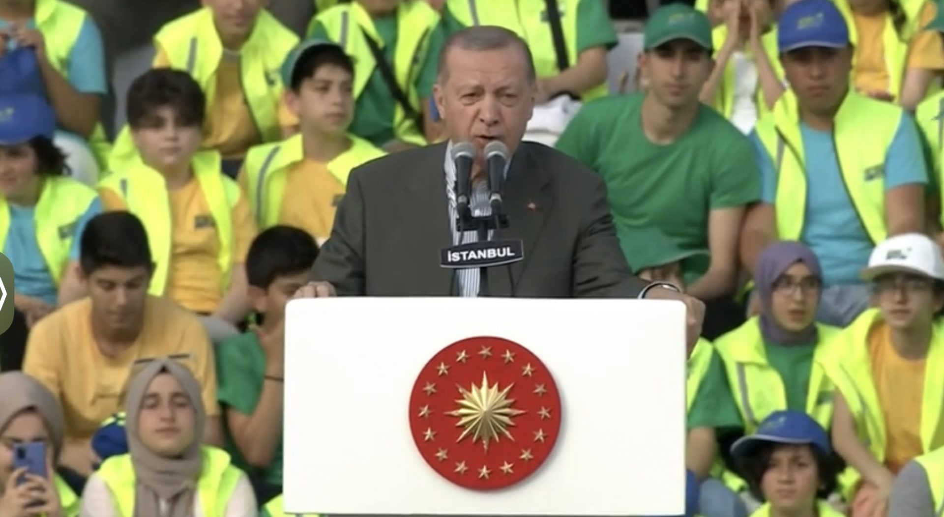 Στο πλαίσιο της ομιλίας του έδωσε ιδιαίτερη έμφαση στους εθνικούς στόχουςπου έχει βάλει για το όραμα του 2053, για μια ισχυρή και ενωμένη Τουρκία, καθώς, όπως είπε, «πρέπει να είναι ενωμένοι οι Τούρκοι» και ότι «τα εθνικά συμφέροντα της χώρας είναι πιο σημαντικά από την πολιτική». «Όπως οι πρόγονοι μας έθαψαν το Βυζάντιο, ας ελπίσουμε ότι σήμερα, χτίζοντας το όραμα μας για το 2053, θα καταφέρουμε και εμείς να βάλουμε στο χρονοντούλαπο της ιστορίας τους σημερινούς Βυζαντινούς που στήνουν ίντριγκες εναντίον μας», τόνισε σε προκλητικό ύφος.
