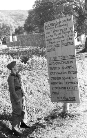 Και κάπως ανορθόγραφα στη δεύτερη:” ΩΣ ΑΝΤΙΠΟΙΝΟΝ ΤΩΝ ΑΠΩ ΟΠΛΙΣΜΕΝΩΝ ΠΟΛΙΤΩΝ ΑΝΔΡΩΝ ΚΑΙ ΓΥΝΑΙΚΩΝ ΕΚ ΤΩΝ ΟΠΙΣΘΕΝ ΔΟΛΟΦΟΝΗΘΕΝΤΩΝ ΓΕΡΜΑΝΩΝ ΣΤΡΑΤΙΩΤΩΝ ΚΑΤΕΣΤΡΑΦΗ Η ΚΑΝΔΑΝΟΣ”.