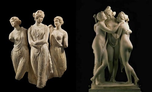 Στο γλυπτό της φωτογραφίας εικονίζονται οι 3 Χάριτες γυμνές να κρατιούνται από τα χέρια και αγκαλιάζονται. Είναι έργο του Αντόνιο Κανόβα, το οποίο εκτίθεται στο Μουσείο Ερμιτάζ. Ο Παυσανίας είχε πει: «Δεν θα μπορούσα να ανακαλύψω ποιος ήταν αυτός πού απεικόνισε πρώτος τις Χάριτες γυμνές, είτε στη γλυπτική ή στην ζωγραφική. Κατά τους πρότερους χρόνους οι γλύπτες και οι ζωγράφοι τις απεικόνιζαν σκεπασμένες».