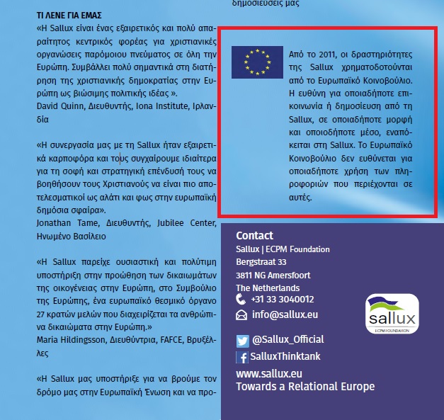 * Το Sallux, πρώην Ευρωπαϊκό Χριστιανικό Πολιτικό Foundation , είναι ένα πολιτικό ίδρυμα σε ευρωπαϊκό επίπεδο και το επίσημο ίδρυμα/δεξαμενή σκέψης του Ευρωπαϊκού Χριστιανικού Πολιτικού Κινήματος, που ιδρύθηκε το 2011.