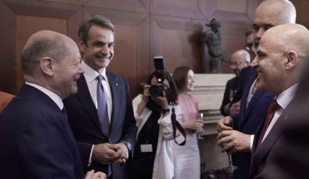 Κατά την υποδοχή του Όλαφ Σολτς σε κεντρικό ξενοδοχείο της Θεσσαλονίκης, όπου η ελληνική Κυβέρνηση παρέθετε γεύμα στους ηγέτες της Νοτιοανατολικής Ευρώπης που συμμετείχαν στη Σύνοδο Κορυφής της Διαδικασίας Συνεργασίας, ο Κυριάκος Μητσοτάκης πήρε τον Γερμανό Καγκελάριο για να του συστήσει τους ηγέτες των κρατών της περιοχής που έδωσαν το παρόν στη Σύνοδο.