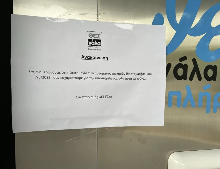 Έτσι, από την περασμένη Τρίτη, 7 Ιουνίου, με μία λιτή ανακοίνωση που αναρτήθηκε στα σημεία αυτόματης πώλησης φρέσκου γάλακτος και άλλων προϊόντων, ανακοινώθηκε η αναστολή λειτουργίας τους.