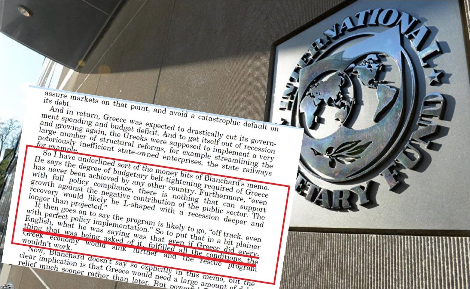 Στη συνέχεια, λέει ότι το πρόγραμμα είναι πιθανό να βγει «εκτός τροχιάς, ακόμη και με τέλεια εφαρμογή πολιτικής». Σε απλά αγγλικά, αυτό που έλεγε ήταν ότι ακόμα κι αν η Ελλάδα έκανε ό,τι της ζητήθηκε, πληρούσε όλες τις προϋποθέσεις, η ελληνική οικονομία θα βυθιζόταν περαιτέρω και το πρόγραμμα διάσωσης δεν θα λειτουργούσε.