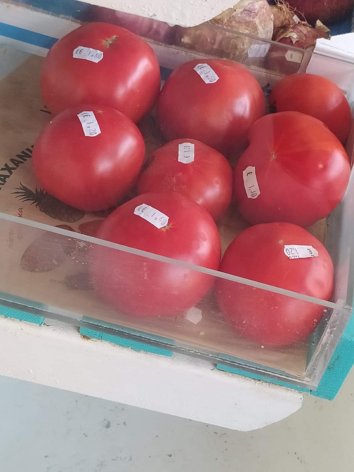 Εντύπωση εχει προκαλέσει στο διαδίκτυο η ανάρτηση με φωτογραφιες απο ελληνικο νησι, που δείχνει τις ντομάτες να πωλούνται σε πολύ υψηλές σχετικα τιμές με το κομματι οπως και τα ξερά κρεμμύδια.