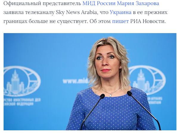 «Η Ουκρανία που εσείς και εμείς γνωρίζαμε μέσα σε αυτά τα σύνορά της που ήταν πριν, δεν υπάρχει πλέον. Και δεν θα υπάρχει. Αυτό είναι προφανές», είπε η Ζαχάροβα.